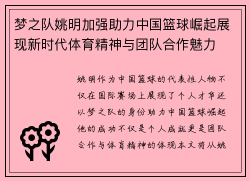 姚明作为中国篮球的代表性人物,不仅在国际赛场上展现了个人才华,还以"梦之队"的身份助力中国篮球崛起。他的成功不仅是个人成就,更是团队合作与体育精神的体现。本文将从姚明对中国篮球发展的推动作用、他在国际舞台上的影响力、团队合作的重要性以及新时代体育精神的传承四个方面进行详细阐述,旨在全面呈现姚明如何加强助力中国篮球崛起,并展现出新时代的体育精神与团队合作魅力。